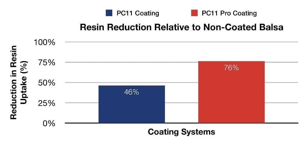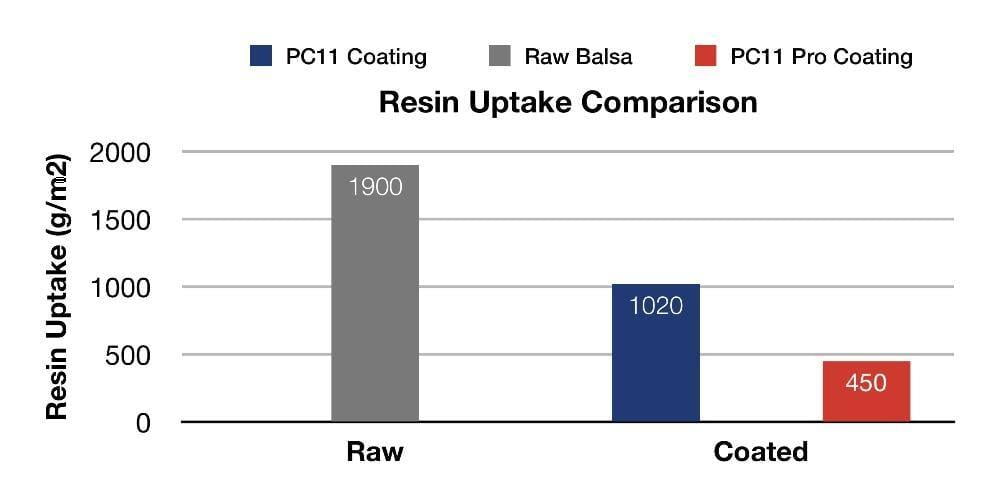 A typical balsa sheet of non-coated balsa wood core will absorb roughly 1900 grams of resin per square meter (177 grams of resin per square foot) during infusion. The standard PC11 formulation was able to reduce the resin uptake by up to 46% to 1020 grams per square meter (95 grams per square foot) of resin uptake. The new PC11 Pro formulation is completely revolutionary as it reduces resin uptake by up to 76% to only 450 grams per square meter (42 grams of resin per square foot).